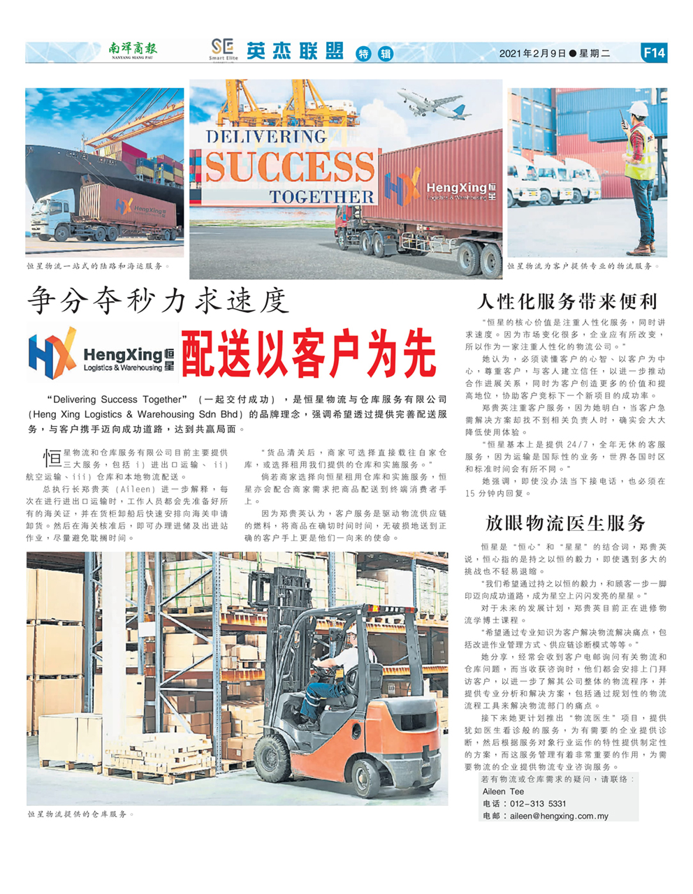 Delivering Success Together (一起交付成功),是恒星物流与仓库服务有限公司 (Heng Xing Logistics & Warehousing Sdn Bhd)的品牌理念,强调希望透过提供完善配送服 务,与客户携手迈向成功道路,达到共赢局面。恒星物流和仓库服务有限公司目前主要提供 ,三大服务,包括 i) 进出口运输、ii) 航空运输、iii) 仓库和本地物流配送。